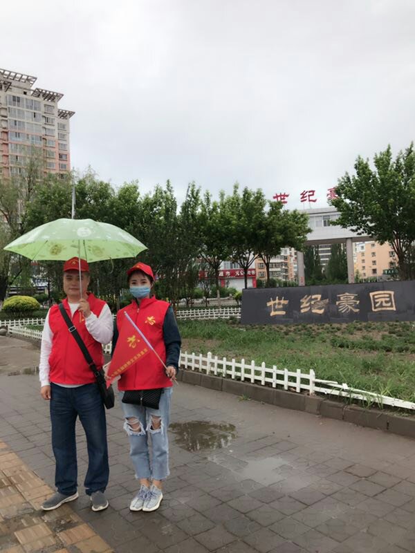 志愿者在纬三路世纪豪园交叉口维护交通秩序